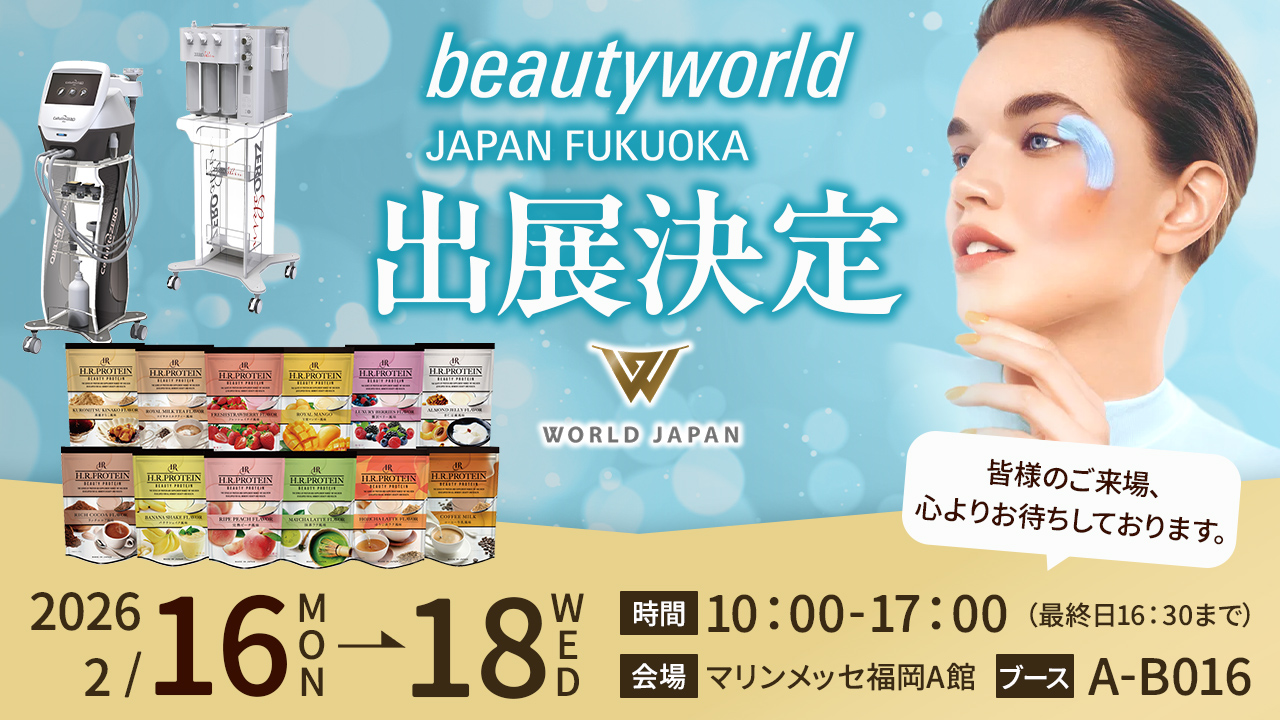 自社サロンで1億円を売り上げた痩身メニューから生まれたセルライトゼロ®シリーズの展示・無料体験をはじめ、ビューティーワールドジャパン東京2025にて初お披露目となり、大注目を浴びた新味のHRプロテインの試飲・販売を中心に、”痩身総合会社”として20年の誇りをもつワールドジャパン株式会社より、サロン売上アップのノウハウをご提案させていただきます。