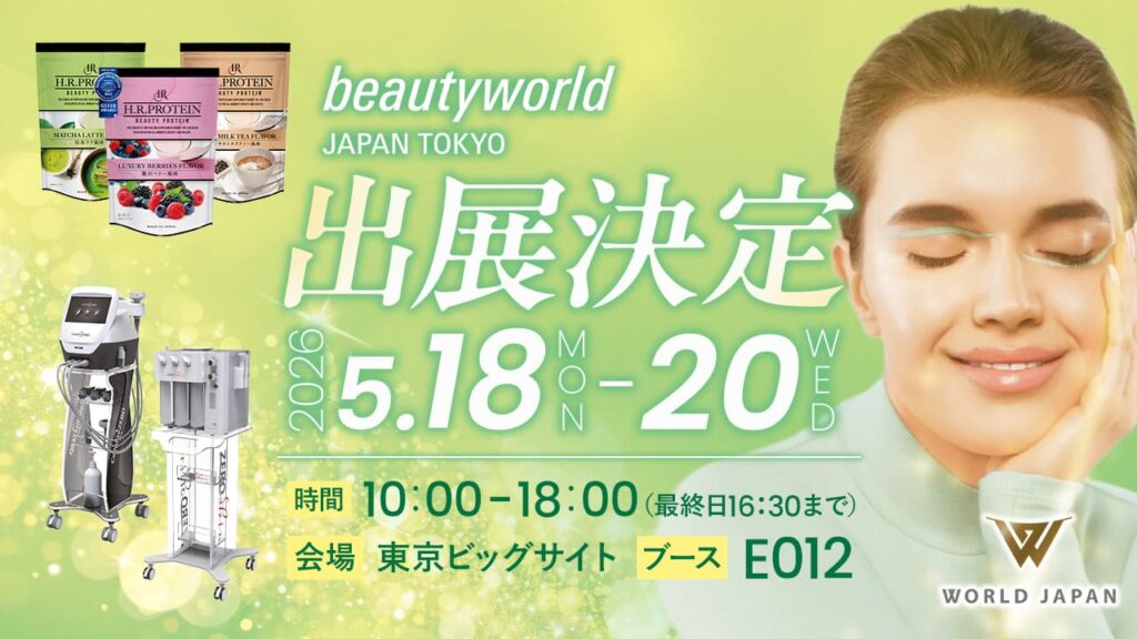 自社サロンで1億円を売り上げた痩身メニューから生まれたセルライトゼロ®シリーズの展示・無料体験をはじめ、ビューティーワールドジャパン東京2025にて初お披露目となり、計12種類となったHRプロテインの試飲・販売を中心に、”痩身総合会社”として20年の誇りをもつワールドジャパン株式会社より、サロン売上アップのノウハウをご提案させていただきます。