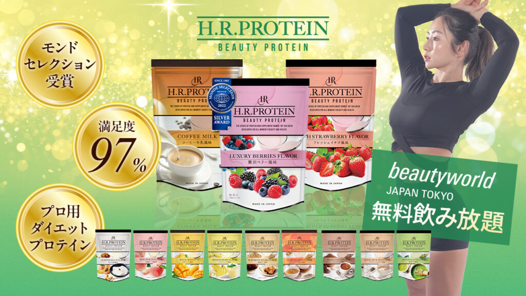 BWJ東京2026では、「H.R.プロテイン」全フレーバーに加え、サプリメントの「H.R.スルー」「H.R.フォーウーマン」の【無料試飲】をご用意。